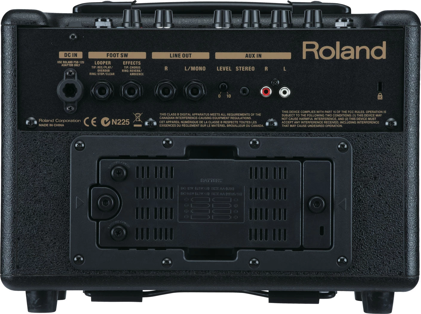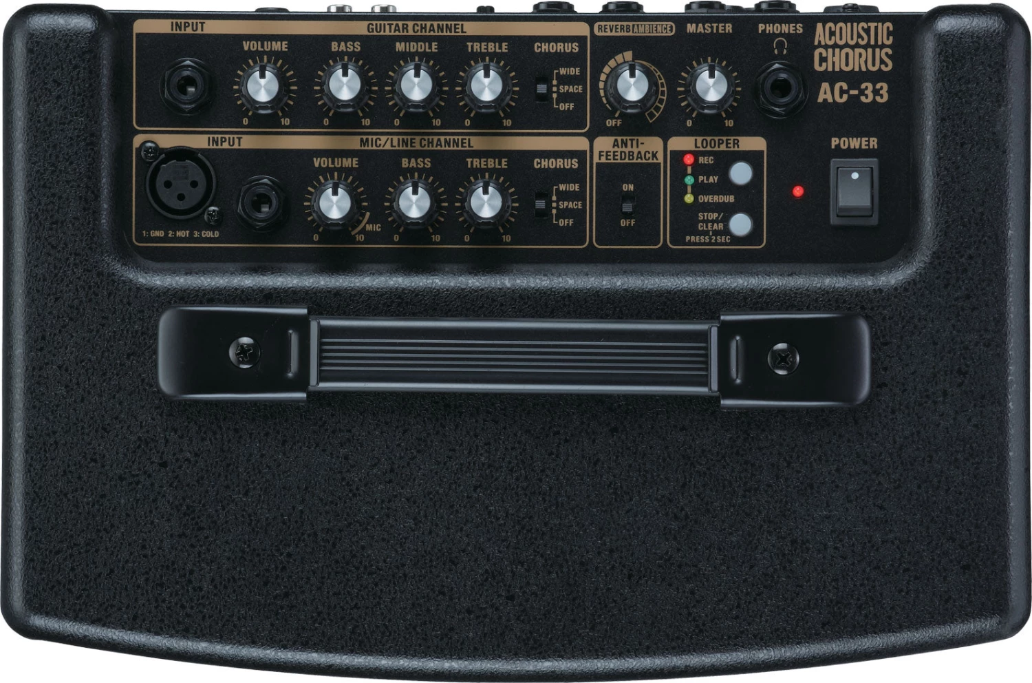 Equipped with Roland’s latest DSP technology, the AC-33, delivers pure, rich acoustic sound with projection far beyond its size. Its true stereo design (15 watts x 2) enables brilliant stereo/multi-band chorus with “Wide” mode, plus shimmering reverb and 3D-type ambience effects tailored specifically for acoustic guitar.