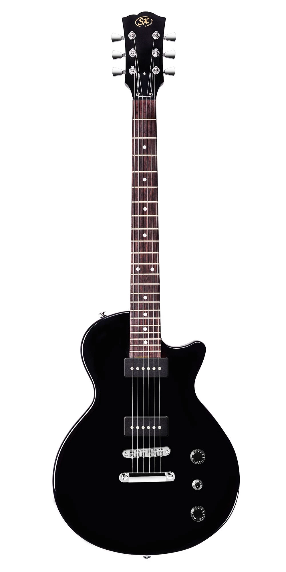 Solid basswood body. Select Canadian maple neck with 2 way truss rod. Rosewood fingerboard with pearl dot inlays. 22 frets. 2 P90 style pickups. 1 volume and 1 tone controls. 3 way toggle switch. Chrome diecast machine heads with tulip buttons. Chrome Tune-O-Matic bridge and tailpiece. Supplied with UPlay Guitar Guide and free online lessons. Black