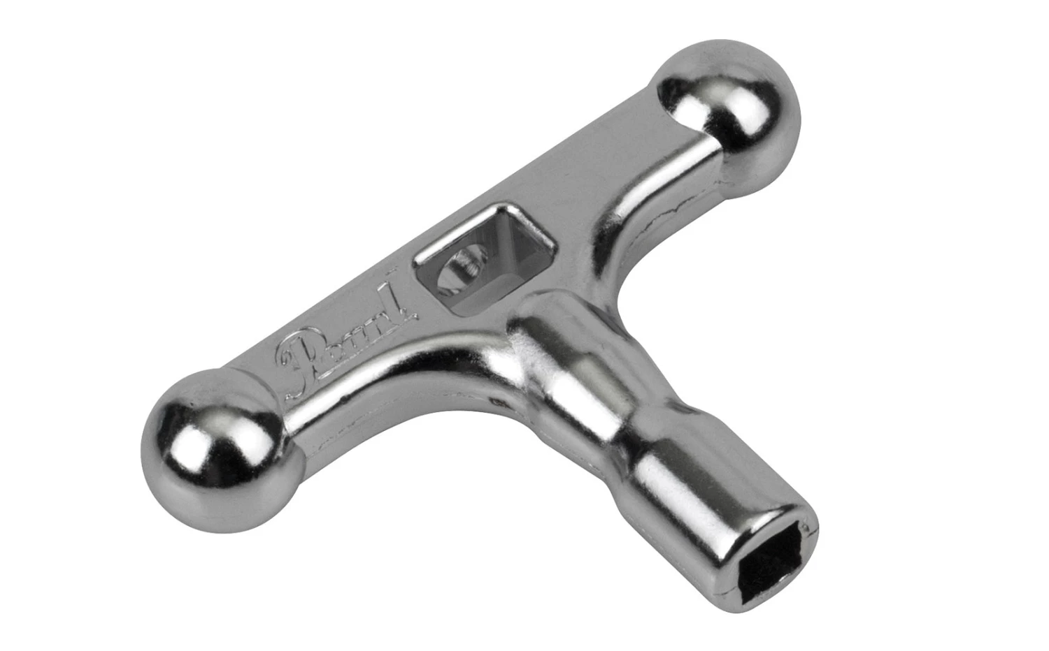 Chrome plated drum tuning key features die-cast construction, Pearl logo, and balance beads on each side of the wide T-handle for better grip and controlled spin.