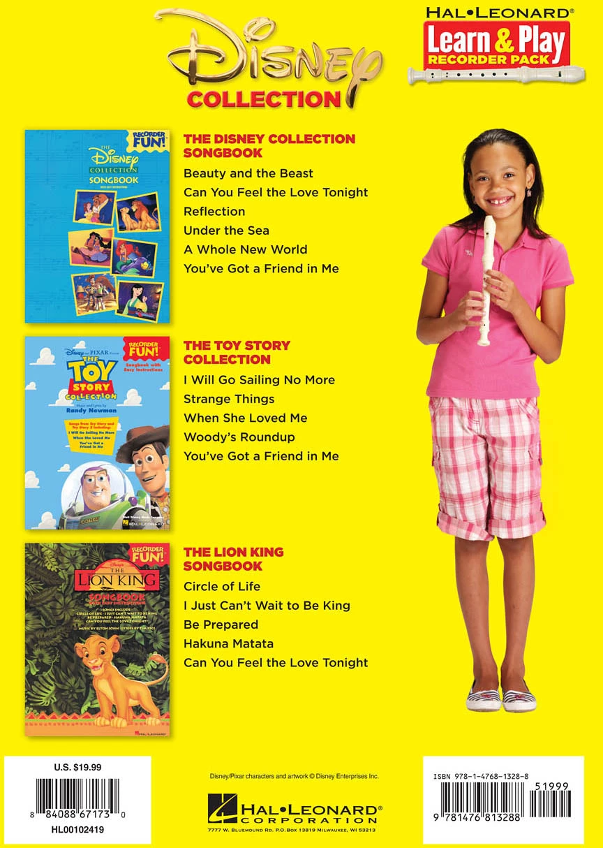 This cool pack contains a high-quality recorder, plus three terrific Recorder Fun! books loaded with 16 huge Disney hits: Can You Feel the Love Tonight 路 Circle of Life 路 Hakuna Matata 路 I Will Go Sailing No More 路 Reflection 路 When She Loved Me 路 Woody’s Roundup 路 You’ve Got a Friend inMe 路 and more. Each book comes complete with instructions for playing t he recorder, and a handy fingering chart.