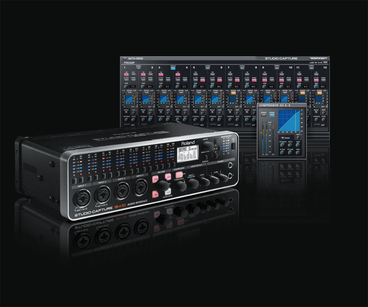 Unique to Roland’s CAPTURE family is the innovative AUTO-SENS feature, which makes it fast and easy to set perfect input levels every time. Just press the dedicated front-panel button, play your connected instruments, and STUDIO-CAPTURE automatically sets the ideal recording level for each input in seconds. Useful for pros and beginners alike, AUTO-SENS is great for quick, fail-safe audio capture when recording a fully mic’d drum kit or an entire band.