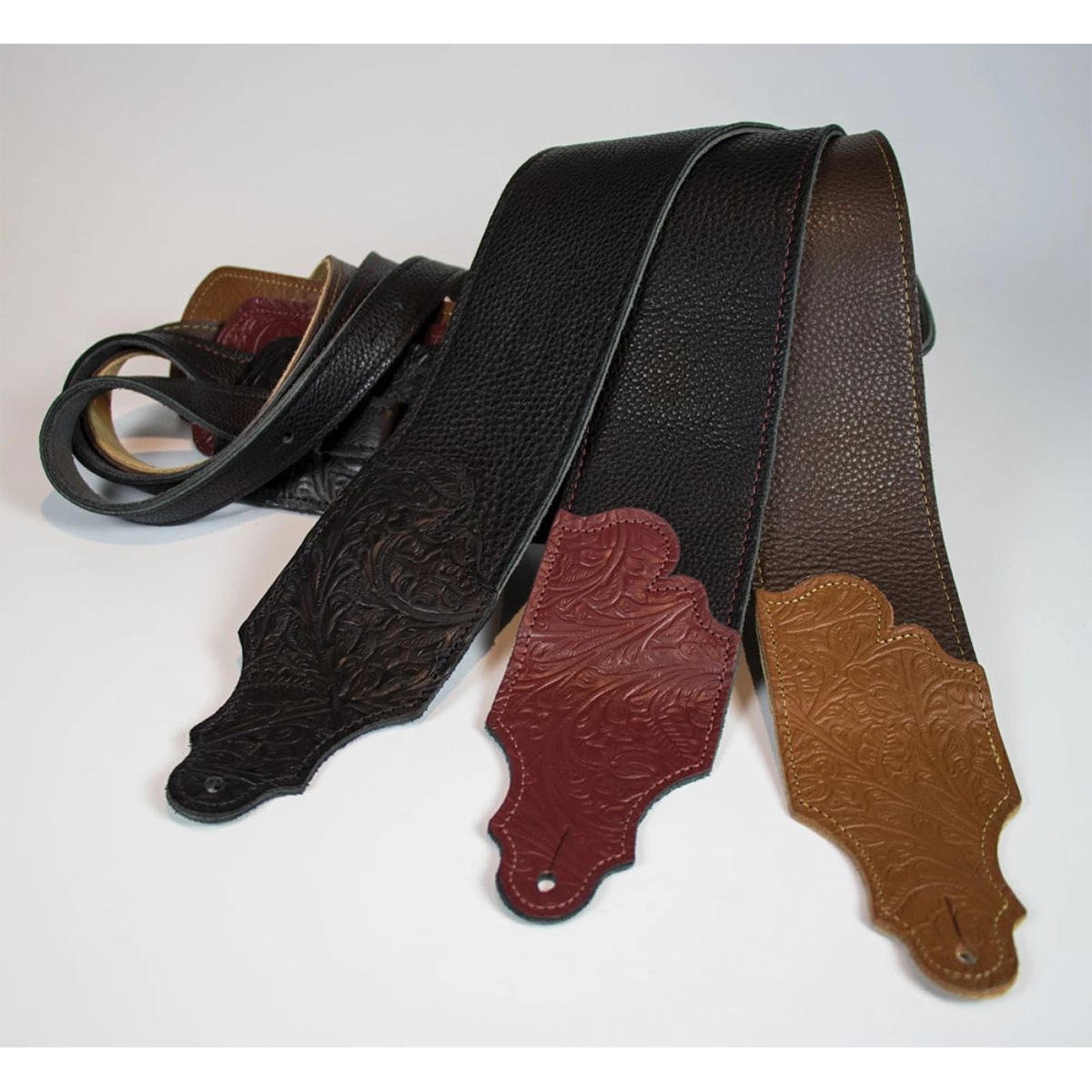 Our Original Glove Leather strap is a two-ply construction of supple glove leather and soft garment suede with double-ply end tabs. It is outlined with careful stitching in contrasting colors for a refined, and tailored look. The end tabs are tooled floral leather for an elegant Old World appeal.