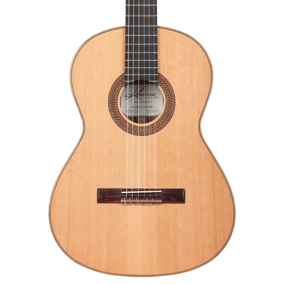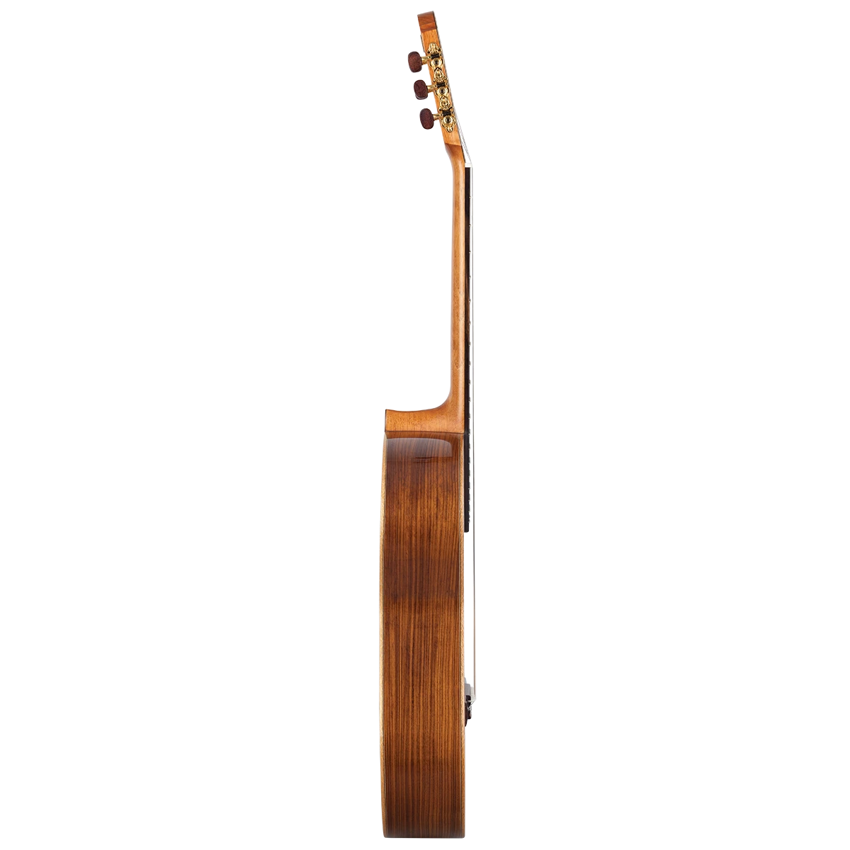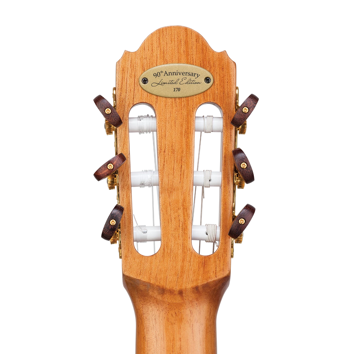 Our 90th is a concept model steeped in tradition with an eye toward the future. The top is of narrow-grained Cedar, specially-bladed to 1.8mm and supported by stiff, ultralight carbon-balsa fused bracing. This approach amplifies bass frequencies, expanding the instrument’s overall volume with increased sensitivity. A dual-channeled Honduras Cedar neck retains musicality while providing physics-proven stability without the necessity of a truss rod.