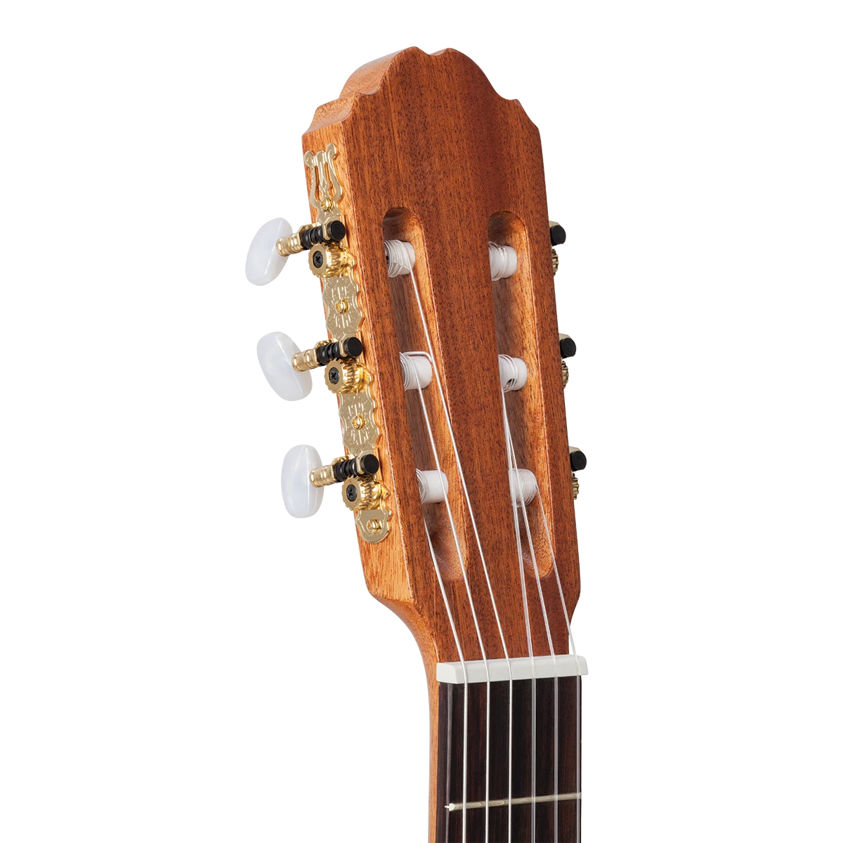 Our beautiful walnut back and sides feature a variety of patterns, streaks and flames. Bright and balanced tone is achieved with the pairing of a solid spruce top.
