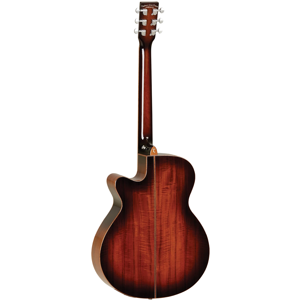 All models feature Elixir Stings, solid tops and with a range of exotic woods making their mark on the back and sides. Our TW11 Olive Woods stand out with their figured wood grain patterns making these models truly unique. The all new all Koa models have the added bonus of Grover machine heads with a burst gloss finish on top and in 4 sizes: Dreadnought, Super Folk, Venetian & our Mini Traveller.