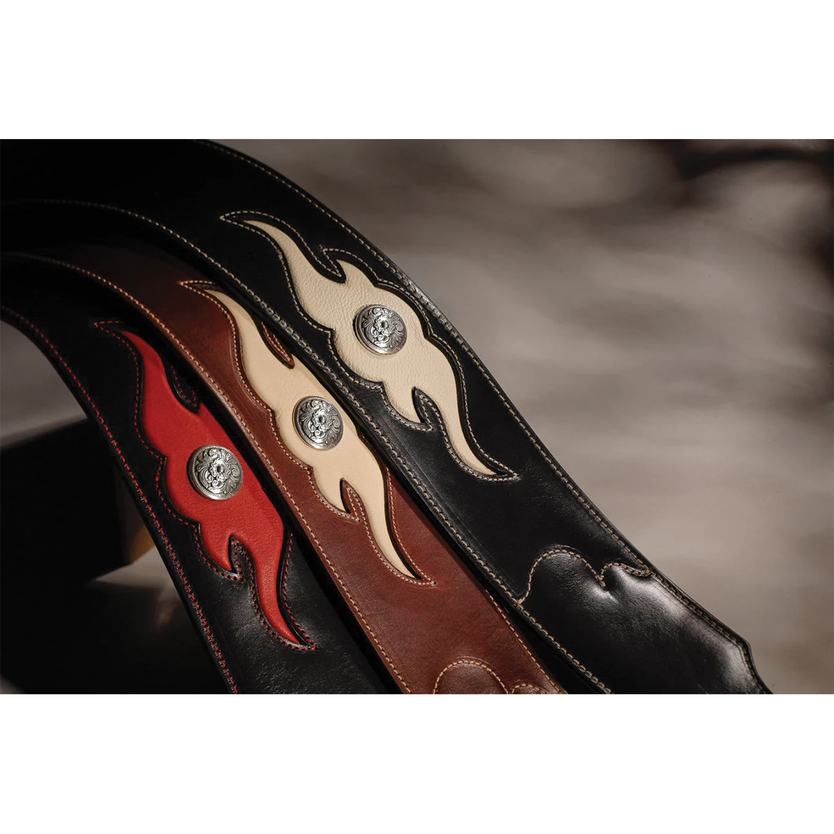 Two unique die patterns were created for the cutouts; a western inspired style and a stylized flame graphic. Richly pebbled leather, supple suede or elegant snakeskin are then inlaid and finished off with a silver concho for a stunning visual effect.
