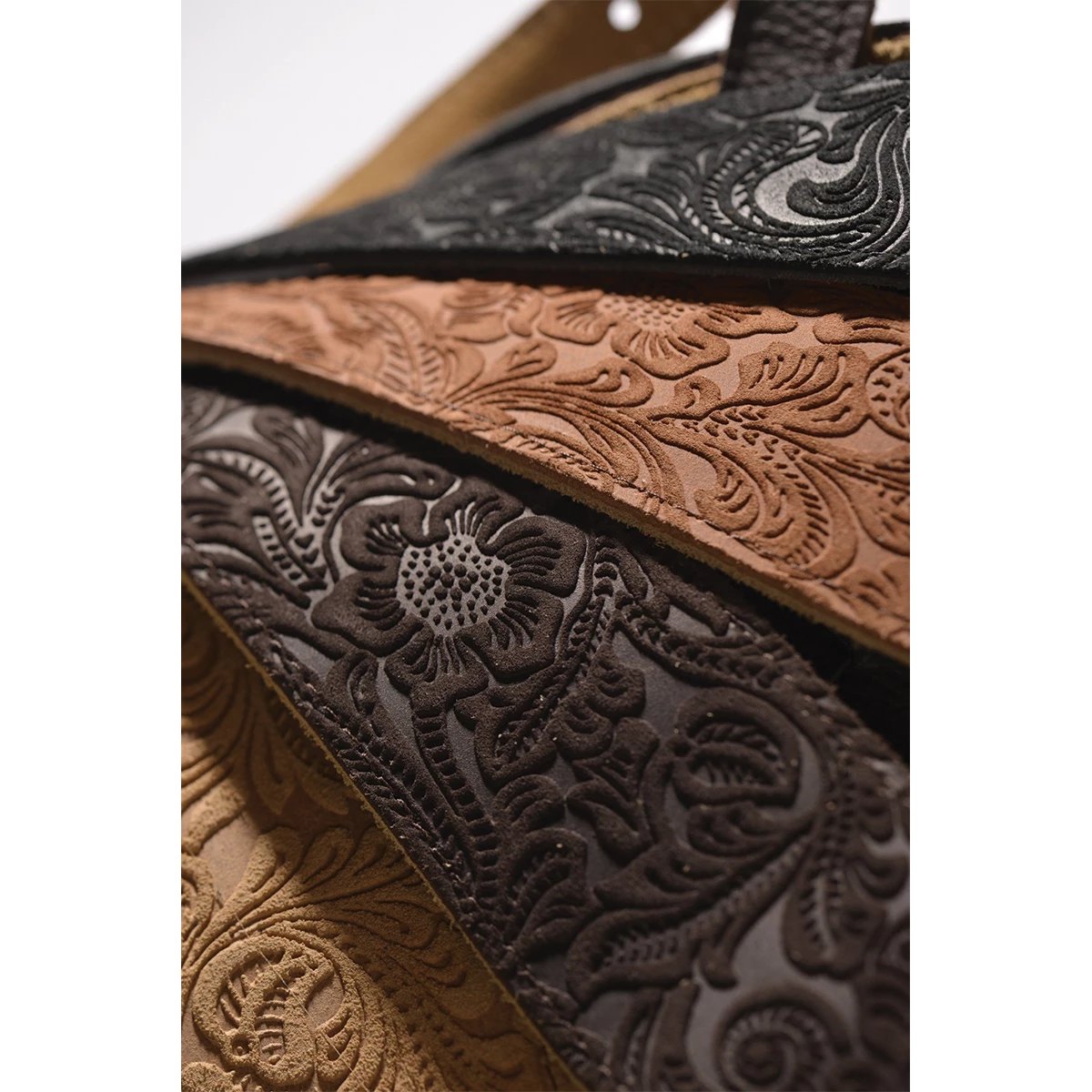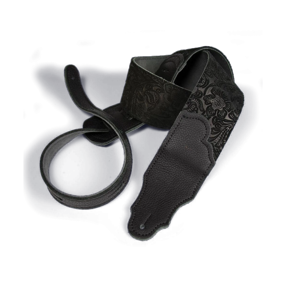 The richly embossed suede and the plush, softly pebbled glove leather end tab offer a beautiful blend of complimentary textures. The pattern in the suede seems inspired by the exquisite fingerboard inlay work of our industries most accomplished artisans.