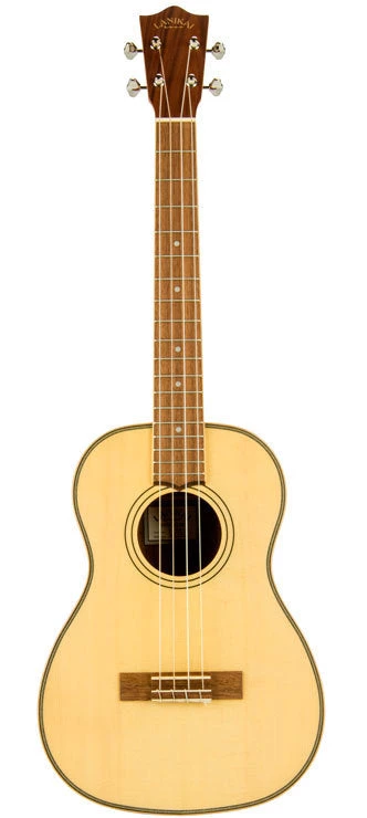 The Solid Spruce Top ukulele by Lanikai has dynamic new features such as a wider nut for player comfort, select woods, Grover® open back tuners, wood marquetry, NuBone XB® nut and saddle, D’Addario®strings, satin finish and a padded gig bag.