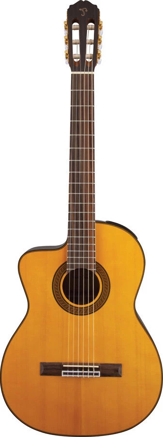 Ready for the demands of any performance situation, the TGC5CE features a fan braced solid spruce top and black walnut back and sides that produce warm, rich nylon string sound. The slim mahogany neck and laurel fingerboard provide great feel and playability, while the onboard Takamine TP-4T preamp system gives you a built-in tuner with three band EQ and gain controls for rock solid amplified performance and versatility.