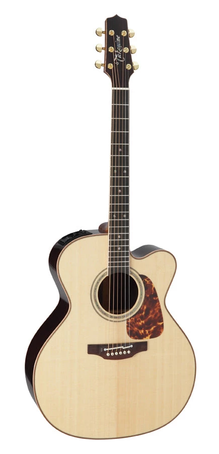 Premium design appointments include an ebony fingerboard with ivory binding, abalone “snowflake” inlays, a dark rosewood headcap with abalone Takamine logo, gold tuners with gold buttons, a natural bone nut and smooth gloss natural finish.
