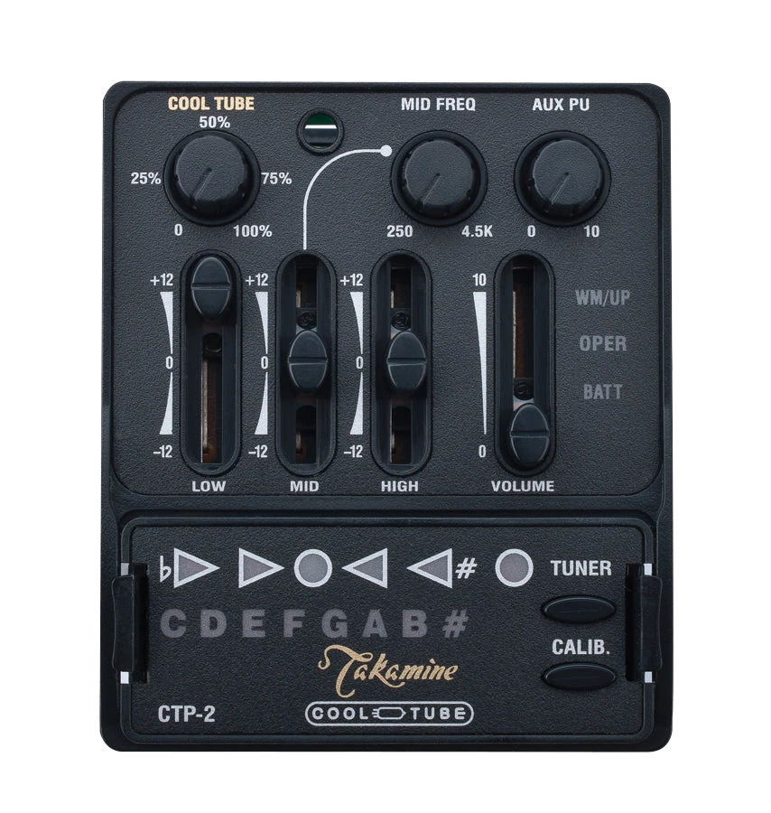 Includes Takamine’s proprietary CTP-2 Cool Tube preamp system. The dual-channel CTP-2 provides low-voltage tube tone, variable from bright and brilliant to thick and warm, three band EQ with semi-parametric midrange, auxiliary input and volume (for use when a second pickup is added), and an onboard chromatic tuner.
