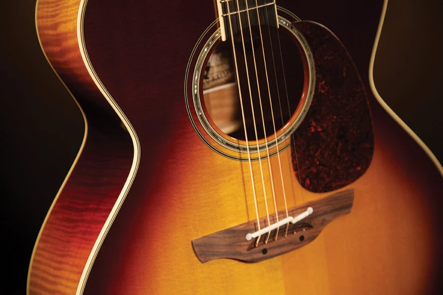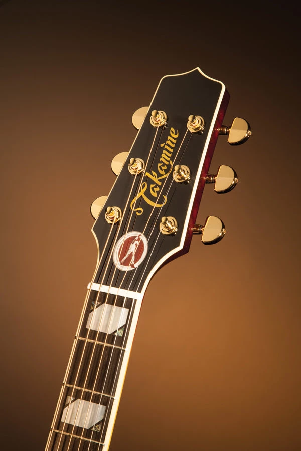 Based on his longtime workhorse acoustic, the Takamine TEF250SMCSB, it features a full-sounding jumbo body with a convenient cutaway, solid spruce top with scalloped “X” bracing, and beautiful flame maple back and sides.