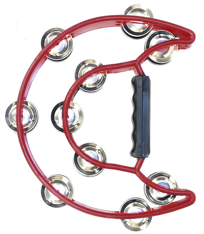 This Percussion Plus hand percussion sound effect is a PVC shell half moon tambourine in red and has 10-Double rows of jingles. Enjoy making beautiful music with Percussion Plus.