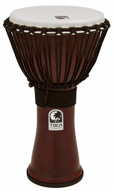 Freestyle II Rope Djembes now take the next step in performance with the installation of all-weather synthetic heads. The new heads eliminate the stretching, drying, and loss of pitch that can occur with natural skin heads due to changes in weather conditions. Thus they offer greater consistency in sound. Synthetic heads can also be tensioned over a wider range, making them able to produce higher, crisper slaps and deeper bass tones. Freestyle II Rope Djembes have also been improved with an increased number of rope runners that allow for improved tuning.