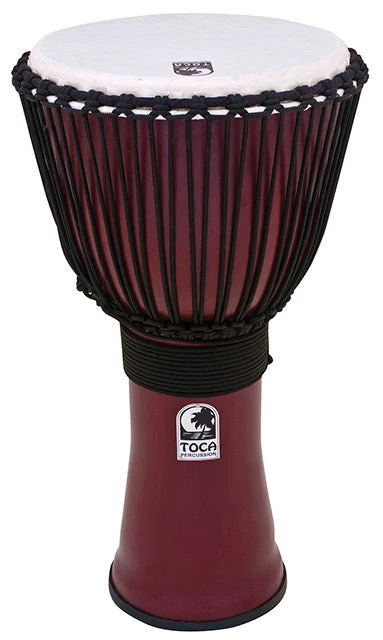 Freestyle II Rope Djembes now take the next step in performance with the installation of all-weather synthetic heads. The new heads eliminate the stretching, drying, and loss of pitch that can occur with natural skin heads due to changes in weather conditions. Thus they offer greater consistency in sound. Synthetic heads can also be tensioned over a wider range, making them able to produce higher, crisper slaps and deeper bass tones. Freestyle II Rope Djembes have also been improved with an increased number of rope runners that allow for improved tuning.