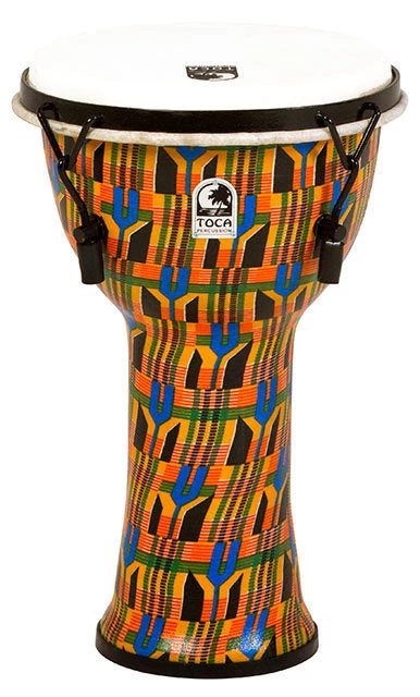 Freestyle II Mechanically Tuned Djembes now take the next step in performance with the installation of all-weather synthetic heads. The new heads eliminate the stretching, drying, and loss of pitch that can occur with natural skin heads due to changes in weather conditions. Thus they offer greater consistency in sound. Synthetic heads can also be tensioned over a wider range, making them able to produce higher, crisper slaps and deeper bass tones.