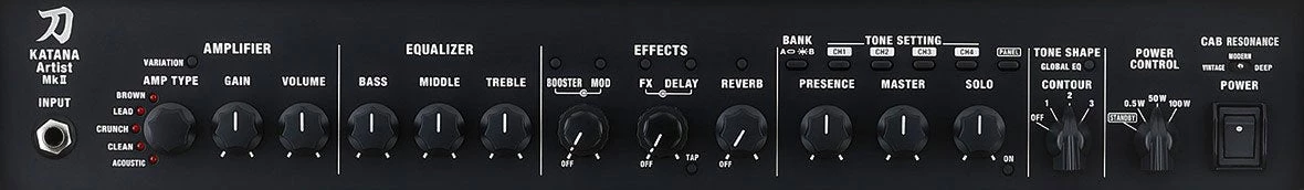 The Katana-Artist MkII elevates the premier model in the Katana lineup with next-generation features and flexibility. Newly voiced variations for all five amp characters double your tone choices, while onboard effects categories have been expanded from three to five. Exclusive front-panel controls provide even more sound-shaping options, including a three-way Contour switch, Global EQ with three customizable curves, and a Solo boost with adjustable level. And with powerful new dual amp functionality, it’s easy to link and control two Katana-Artist MkIIs for massive, ultra-wide tones.